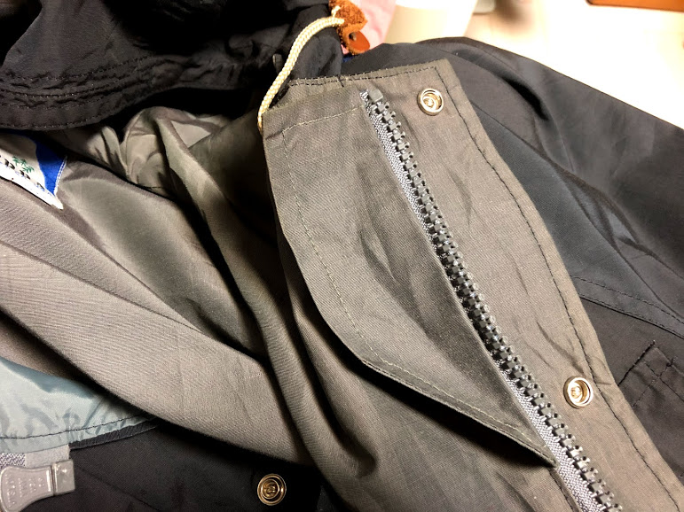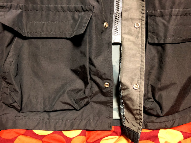 지퍼는 플라스틱에 금속 손잡이. 버튼이랑 다 자석 대봤는데 모두 쇠는 아니다. 위에서 보다시피 맨 아래가 상당히 비어있다. 단추로 두 칸 정도가 비어 있는데 M-65가 이 비슷하게 아래가 비어 있다. 보통 이런 옷은 지퍼 손잡이가 위 아래 두 개 달려있는데 그냥 아래를 비워 버린 게 아닌가 싶다. 뭔가 허전한데 방수 측면에서 보자면 아래야 어떻든 별로 상관없고 앉았다 일어났다 할 때 걸리적 거리지 않는다.
