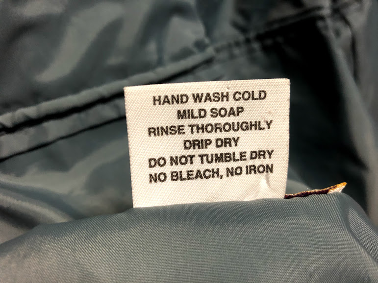 요즘에 나오는 건 세탁 금지, 드라이크리닝 온리 라벨이 붙어 있는데 조금 예전 버전에는 물세탁 가능이라고 적혀 있다. 염색이 잘 빠지기 때문에 세탁 금지 라벨을 붙이기 시작한 거 같다. 그냥 발수 아웃도어 세제로 세탁기에 돌리고 있다. 이런 옷을 드라이크리닝하라는 건 앞뒤가 맞지 않는다. 얼룩덜룩 색이 빠지면 그냥 그대로 재밌는 게 아닐까.