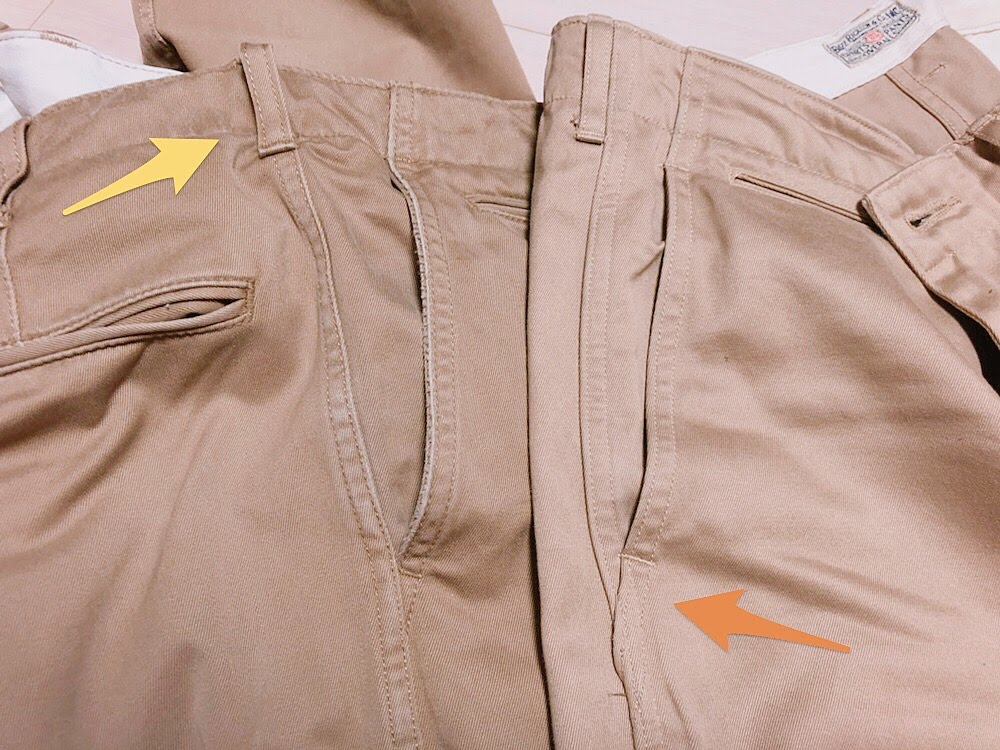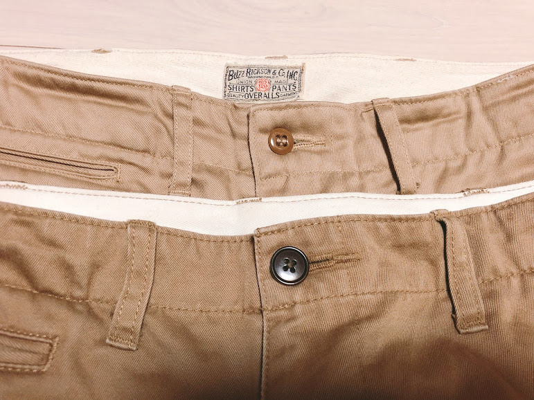 왼쪽이 유니클로의 노턱 빈티지 치노. 오른쪽이 버즈 릭슨의 오리지널 치노. 여기서 오리지널은 치노의 오리지널이 아니라 버즈 릭슨의 오리지널이라는 뜻이다. 즉 버즈 릭슨이 고유로 개발해 낸 치노. 빈티지 복각 라인으로 1942 모델과 1945모델이 있는데 지퍼 플라이 / 버튼 플라이, 바지 사이드 처리 방식, 무엇보다 바지 폭이 다르다.