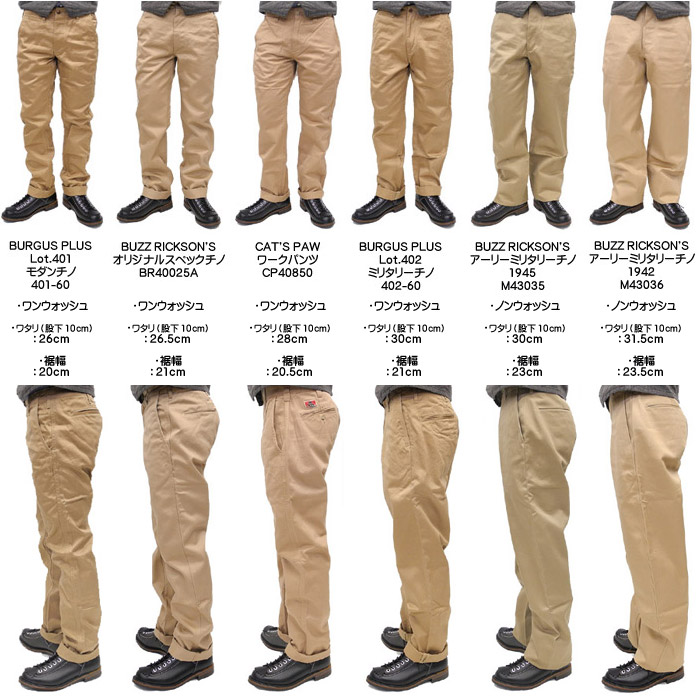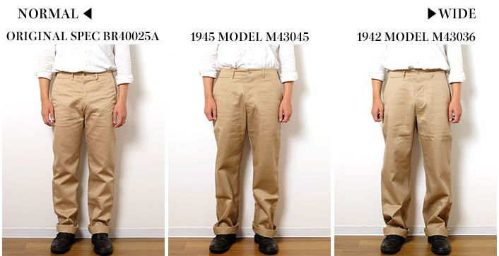 참고 사진. 오리지널 치노는 맨 왼쪽으로 바지 폭이 가장 좁은 타입이다. 즉 도시 사용용 개량 버전. 좁아 봤자 복각 모델에 비해 좁은 건데 뭐랄까.. 와이드라는 느낌이 나기 직전의 폭이다. 요새 바지 기준으로 보자면 레귤러 핏보다는 넓은 인상을 준다. 1942는 거의 한복 느낌.