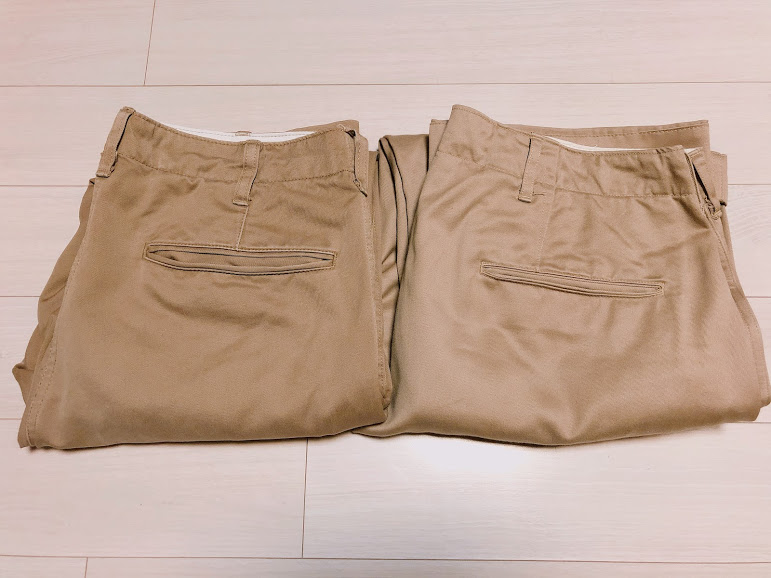 결론적으로 보자면 둘이 분명 차이는 있는데 가격 차이로 충분히 납득할 수 있는 정도다. 둘 다 있으면 비교 체험이 가능하니 좋고 대신 같은 색은 사지 말 것을 추천한다. 베이지도 카키도 하나만 있으면 충분함. 폭의 차이 정도로 같은 색 두 개를 가질 이유는 아주 디테일한 아메카지 룩을 추구하고 있는 게 아니라면 별로 없다고 생각한다.