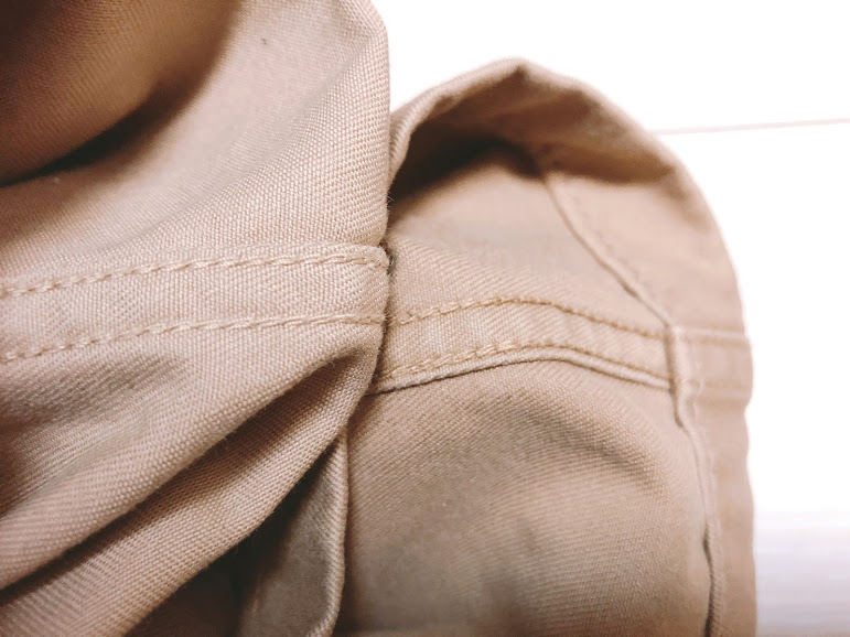 아무튼 다시 위로 돌아가면 유니클로는 브라운 컬러. 유니클로 치노는 색이 여러가지가 나온다. 버즈 릭슨은 베이지 컬러. 베이지와 카키였나 올리브였나 두 가지 정도 나오는 걸로 알고 있다. 둘 다 브라운 톤이지만 버즈 릭슨 쪽이 살짝 반짝거리고 자연광 아래에 있으면 복숭아 빛? 핑크 톤? 뭐 이런 느낌이 살짝 난다. 두께 차이가 약간 있는데 만져봐서는 티가 그렇게 나진 않고 입고 다니다 보면 버즈 릭슨 쪽이 더 두껍구나 알 수 있다. 사이즈는 버즈 릭슨이 한 사이즈 크다. 세탁하면 살짝 줄어든다고 해서 그렇게 했는데 지금 보면 둘이 허리 실측 사이즈는 거의 비슷하다.