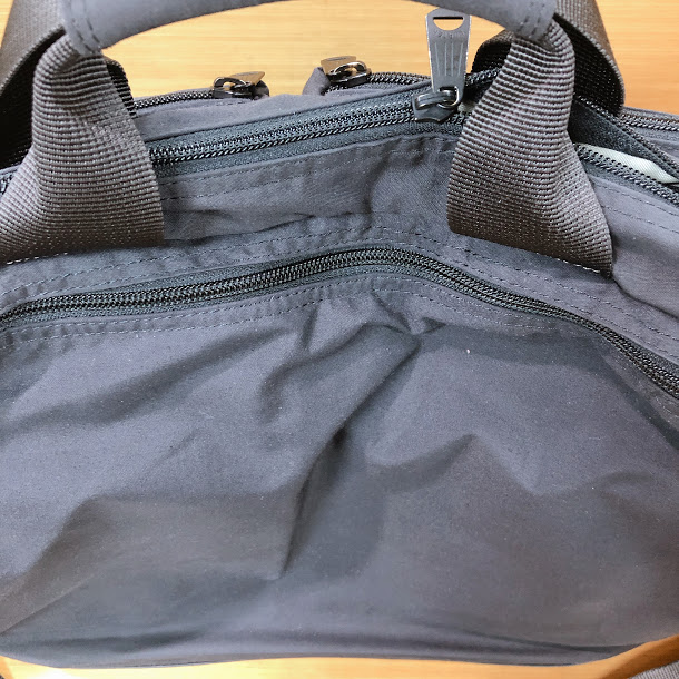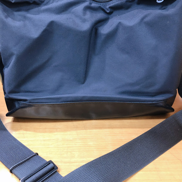 예컨대 이 가방의 경우 위 사진처럼 아래 부분이 네모 형태로 만들어져 있음에도 네모 형태로 고정이 되지 않는다. 들고 다니면 이 불규칙한 모습은 더욱 심해지는데 크로스백 형태로 메고 다니면 아래 부분이 반원형 형상을 이루게 된다.