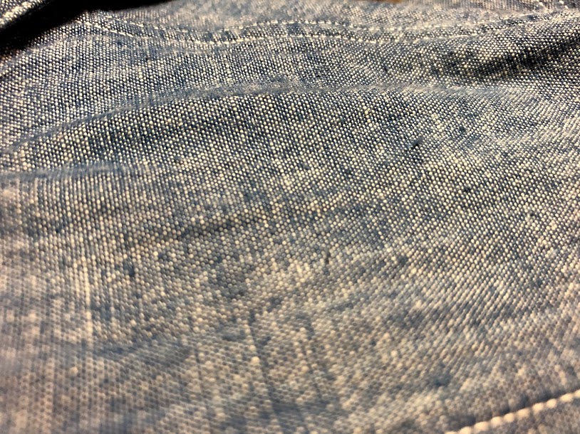 이 사진은 무슨 업체에서 찍은 건데 그럼에도 잘 찍은 거 같진 않다. 저건 새 제품 사진이고 지금 입고 있는 건 이거보다는 조금 밝아지지 않았나 싶긴 한데. 샴브레이 같은 건 색이 얼마나 빠지고 있는지 감이 잘 잡히지 않는다. 조금 하얘진 건가? 싶지만 예전에도 이랬는데? 싶어진다. 데님도 비슷하긴 한데 스폿 탈색은 눈에 잘 띄지 않아도 줄이 생기기 때문에 그걸로 실감이 나는 편이다.