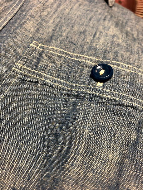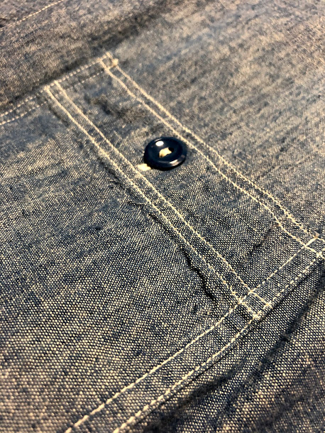 이 사진은 무슨 업체에서 찍은 건데 그럼에도 잘 찍은 거 같진 않다. 저건 새 제품 사진이고 지금 입고 있는 건 이거보다는 조금 밝아지지 않았나 싶긴 한데. 샴브레이 같은 건 색이 얼마나 빠지고 있는지 감이 잘 잡히지 않는다. 조금 하얘진 건가? 싶지만 예전에도 이랬는데? 싶어진다. 데님도 비슷하긴 한데 스폿 탈색은 눈에 잘 띄지 않아도 줄이 생기기 때문에 그걸로 실감이 나는 편이다.