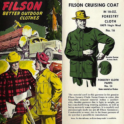 참고로 옷 이름에 대해 이야기를 해보자면 필슨 매키너 크루저가 가장 유명하다. 여기서 매키너는 옷감 이름이고 크루저는 옷 이름이다. 즉 필슨의 크루저라는 옷인데 매키너로 만들었다. 매키너는 매키너 지방에서 시작된 울의 종류다. 특징은 물을 자기 무게의 30%인가 까지 흡수함. 겨울에 습한 지역에서 야외 작업을 염두에 둔 울이다. 가끔 필슨st의 옷을 만들어 놓고 매키너라고 이름을 붙인 경우가 있는데 그러니까 크루저라고 해야 맞다. 매키너 울로 만든 다른 옷은 거의 보기가 힘든데 세계 대전 때 미군 옷 중에서 몇 가지 찾을 수 있다. 그것도 필슨이 만들었다.