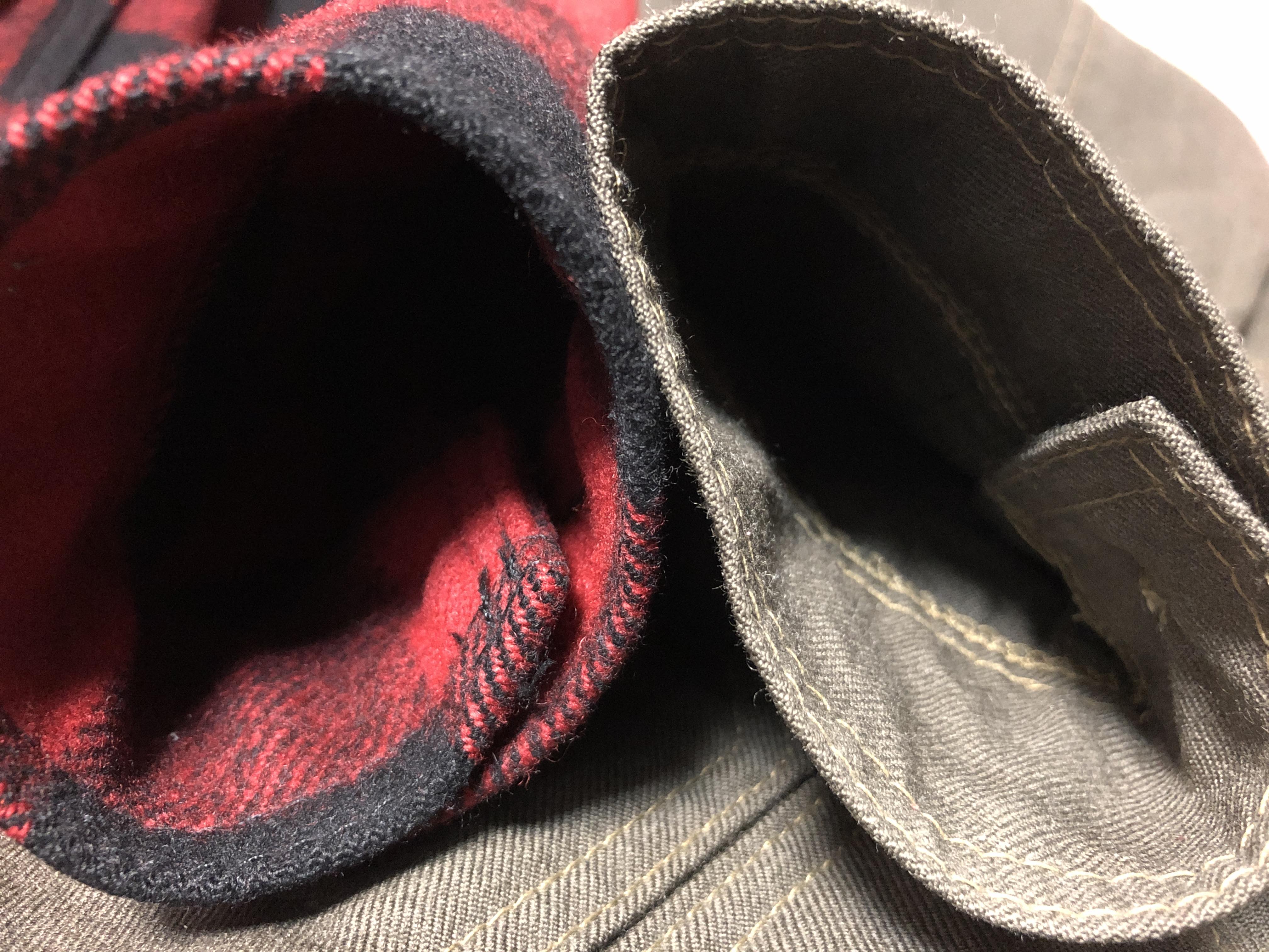 그리고 아래 주머니는 자주 쓰고, 그러니까 계속 열어 놓는 경우가 많다. 이 경우 걸으면 흔들리면서 딱딱 하고 스냅 버튼 부딪치는 소리가 난다. 잊지 말고 잠가 놓으라고 그랬을 지도 모르는데 신경 쓰인다. 숲속을 뛰어 다니거나, 말을 타거나 하지 않아서 정확히 어떤 필요가 있는 건지는 잘 모르겠다. 하지만 만약 저기를 플랩 없이 만든다면 상단의 두 개의 주머니와 발란스가 깨진다. 이런 게 필슨의 특징이라고 생각하는 데 이 부분은 맨 아래서 조금 더 자세히 이야기를 함.