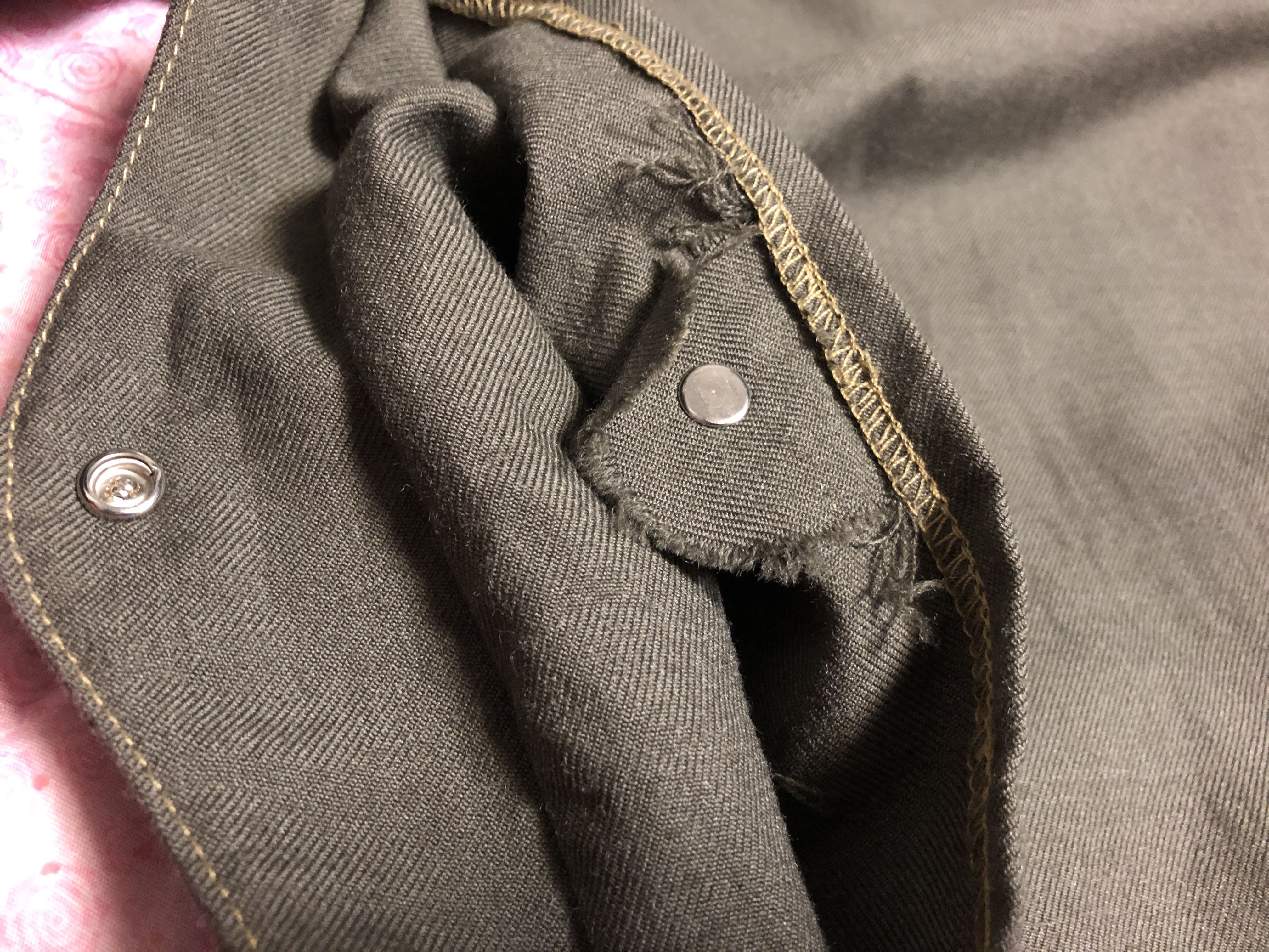 게임 포켓 단추 부분. 조금 접혔는데 옷 쪽 스냅 버튼에 동그란 모양으로 보호 부분이 있다.