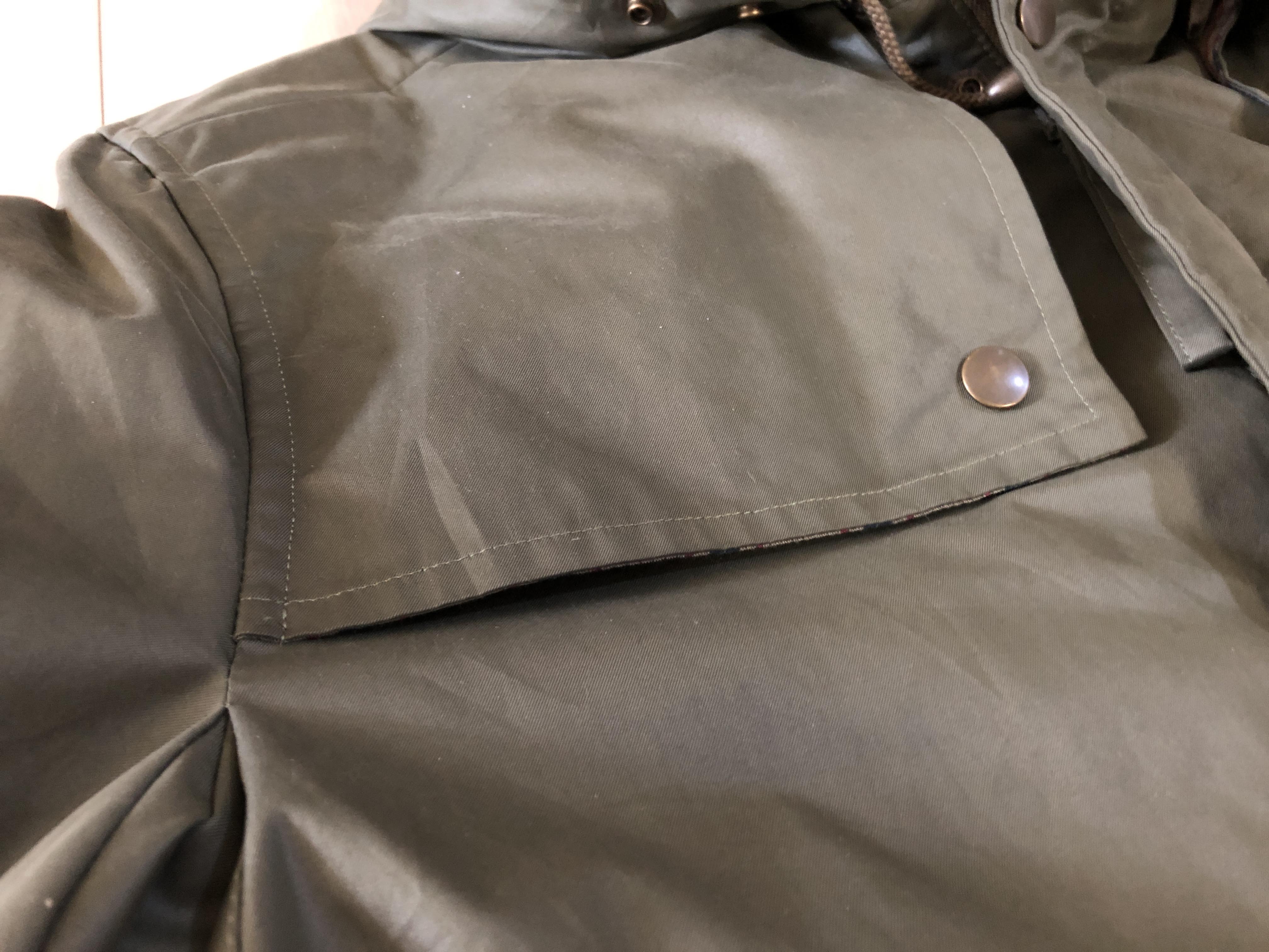 어깨 앞뒤로 있는 덮개. 비를 조금이라도 더 막고 약간의 보온성을 더하기 위해 붙어 있는 부분이다. 단추는 열 수 있는데 어디다 쓸 데는 없다. 기능을 표방한 디자인을 하면서 이렇게 쓸모는 없고 자리를 채우기 위한 장식형 단추가 들어간 건 역시 아쉬운 부분이다.