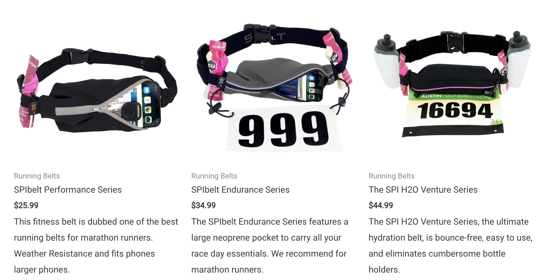 기본적인 구조는 같은 데 뭐가 조금씩 더 들어간 거다. 위 사진 맨 왼쪽 퍼포먼스 시리즈는 벨트 부분에 달리기 하다가 중간에 먹을 걸 끼워 넣을 수 있다. 엔듀어런스는 출전 번호판을 달 수 있고 맨 오른쪽 벤쳐 시리즈는 거기에 작은 물통도 양쪽에 달 수 있다. 즉 약간 더 장거리 달리기 용이다. 저 물통은 8온스(226ml) 정도의 작은 전용 물통을 쓴다. 뭐 달릴 때 물 안 주는 데서 쓸 수 있겠다 싶은데 양쪽 합쳐서 500ml 생수병 정도 되니까 정말 유용한지는 잘 모르겠다. 달려봤어야 알지.