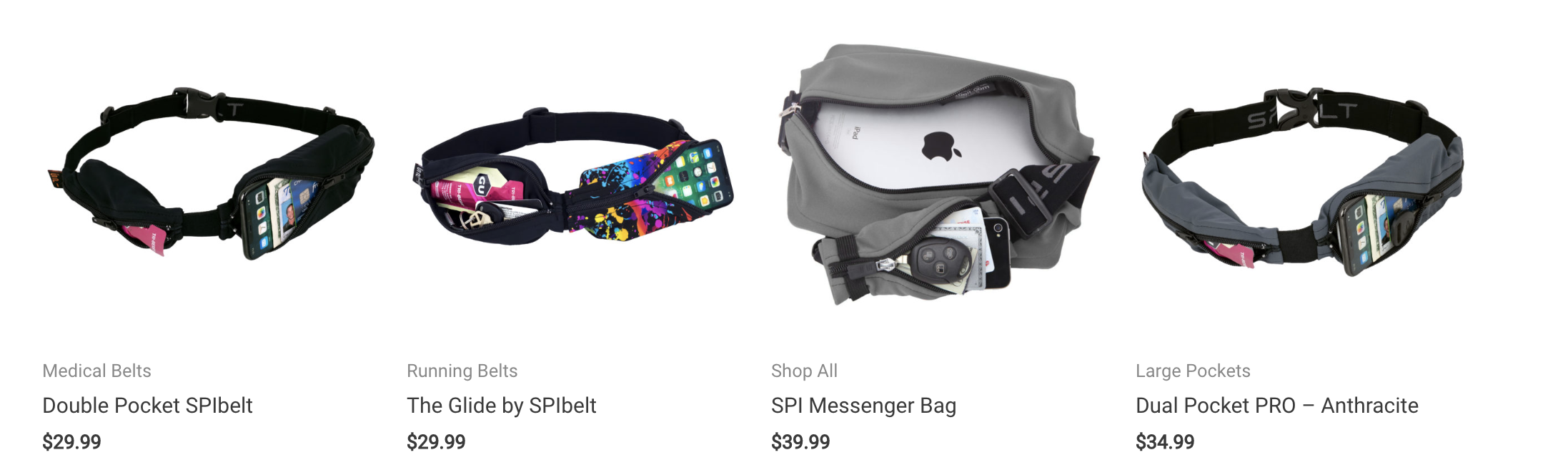위에 게 스피벨트, 아래 거가 플립 벨트. 위에는 신축성 좋은 작은 주머니가 달려 있고 아래는 허리 벨트 느낌으로 균일하게 감싼다. 복대 비스무리한 느낌이 강하다. 위 스피벨트 사진을 보면 저 분이 세 개나 붙이고 있어서 저렇게 보이는 거고 하나만 쓰면 된다. 아래는 보다시피 탈착이 안되기 때문에 거슬리는 부분이 없지만 사이즈를 정확히 구입해야 한다. 플립 벨트 쪽이 훨씬 비싸긴 한데 두 제품 다 다양한 저렴 버전들이 나와있다. 또한 예를 들어 뉴발란스에서는 스피벨트 처럼 생긴 걸 판매하고 있고 리복에서는 플립 벨트처럼 생긴 걸 판매하고 있다.