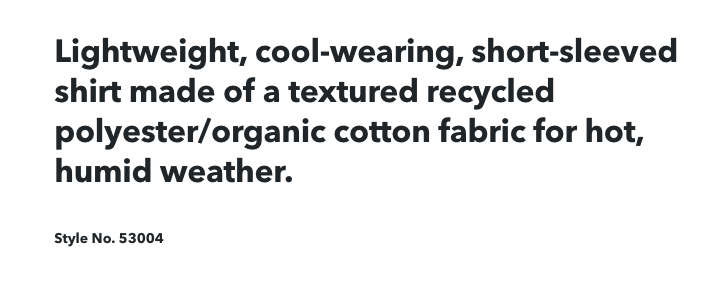 셔츠마다 특징이 적혀 있는데 많은 반소매 버튼 셔츠에 시원하다, 가볍다 등등의 이야기가 적혀 있지만 특히 퍼커웨어에는 뜨겁고 습한 날씨에 좋다!고 적혀 있다. 그렇다 습할 때는 시어서커다! 바로 이곳의 여름이다! 보통 시어서커는 100% 코튼이지만 퍼커웨어는 재활용 폴리에스테르 혼방이다.