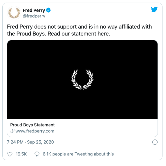 어쨌든 저번 달 프레드 페리는 미국내 매장에서 특정 제품의 판매를 중단한다고 발표했다. 그러면서 트위터를 통해 프레드 페리는 프라우드 보이스를 지지한 적도 없고 도움을 준 적도 없다는 이야기를 남겼다.