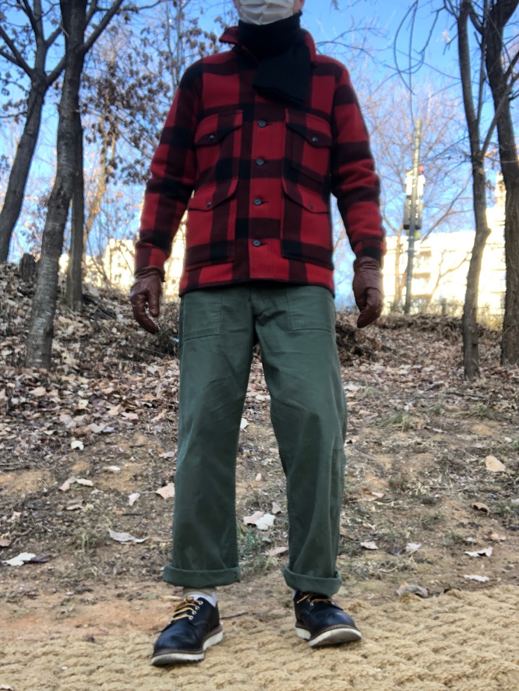 럼버잭 모드. 베이스 레이어는 어쩔 수 없었지만(몽벨 레깅스) 미드 레이어와 머플러, 양말 등은 모두 울을 사용했다. 장갑은 가죽이긴 한데 얄쌍해서 추웠다. 아래에서 위로 찍었더니 옷이 작아 보이고 그늘이라 어딘가 음침해 보인다. 럼버잭이니 톱이나 도끼가 있어야 할 거 같지만 그런 건 없다. 영하 10도 아래에 바람도 꽤 불었지만 예상했던 것보다 따뜻했음. 아래 조합을 통틀어도 몸통은 가장 따뜻한 편인데 대신 그만큼 무겁다. 바지도 두꺼운 면 퍼티그인데 괜찮았다. 다만 귀가 상당히 시렸다. 급하게 나오느라 그 생각은 못했지.