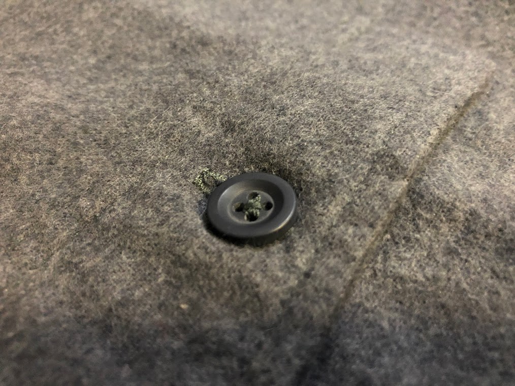 위 사진에서도 슬쩍 보이지만 무뚝뚝한 플라스틱 단추. 약간만 반짝거려도 좋을 거 같은데 약간 아쉽다. 그레이 컬러에는 초록색 실을 사용했다.