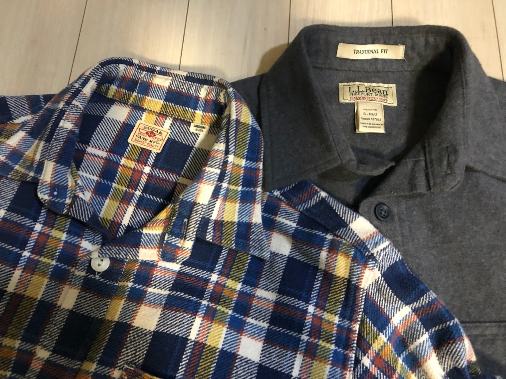 슈가 케인의 헤비 플란넬 셔츠와 함께. 두께는 거의 비슷한데 촉감은 상당히 다르고 엘엘빈 쪽이 더 무거운 느낌이 있다. 슈가 케인은 15 1/2 사이즈인데 저 셔츠 위에 샤모아 셔츠를 입을 수도 있다... 하지만 이런 면 따위 겹쳐 입어봤자 한국의 겨울엔 별 효용이 없다. 면 셔츠 자체가 별 효용이 없음.