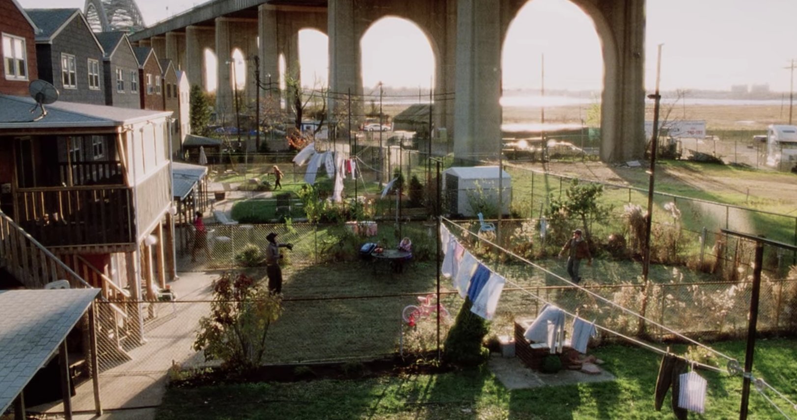 영화의 장면. 캐치볼을 하고 있음. 빨래도 널려 있음. 각자의 집에서 다들 바빠 보인다.