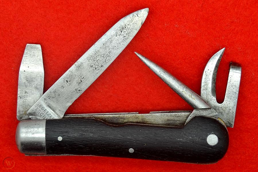 이게 1891년 10월부터 받기 시작한 최초 모델들이고 이후 의료 기구를 제조 회사를 운영하던 칼 엘제너가 스위스에서 직접 만들기로 결정 독일 회사랑 경쟁을 하게 되었지만 독일의 웨스터 사는 대량 생산 능력이 있는 곳이고 제조 비용을 따라갈 수가 없었기 때문에 결국 도산 위기에 처하는 데 그러던 1896년 스프링 메카니즘이 들어가 살짝 올리면 짝 펴지는 방식을 고안해 냈다고 한다. 이게 1897년 스위스 오피서의 스포츠 나이프라는 이름으로 특허를 받게 되었다. 스위스 군에서 딱히 용도 제한을 하지 않았기 때문에 이게 세계로 알려지게 되었다고 한다.