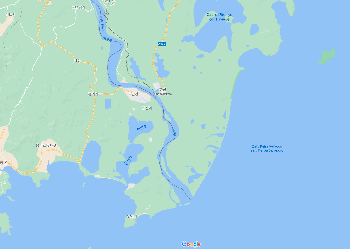 보면 블라디보스토크에서 북한 두만강 쪽으로 있는 도로가 A189, 중국 쪽에 훈춘으로 들어가는 도로가 S201이라는 도로다. 블라디보스토크에서 훈춘으로 가는 도로가 없고 경로 검색을 해봐도 루트가 안 나와서 버스가 어떻게 가는 지는 모르겠다. 지도를 확대해서 보면 크라스키노라는 곳에서 훈춘으로 가는 작은 도로가 있긴 함.