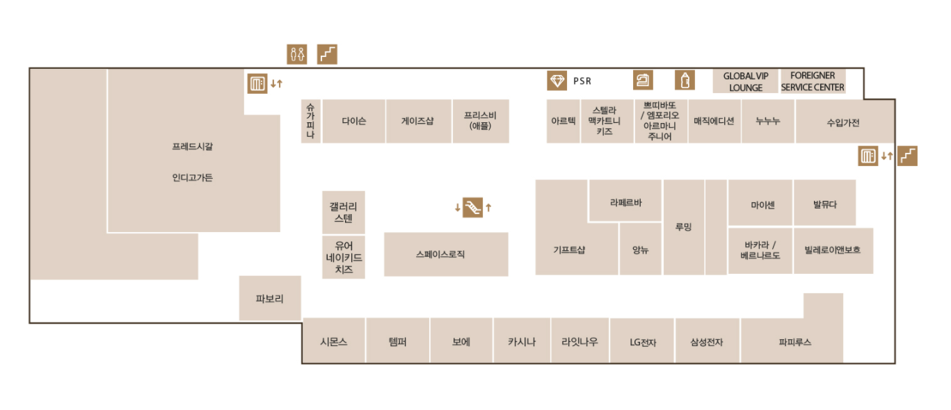 매장 도면으로는 제대로 표현이 안되는데 맨 왼쪽 부분이 야외 테라스다. 프레드 시갈, 인디고 가든(커피 파는 곳)에서 문이 몇 개 있고 나가면 위에 찍은 사진이 있는 장소가 나온다. 벤치도 놓여있고 뭐 그러함. 날이 꽤 흐린 날이어서 LA의 여름을 표현한 밝은 판넬이 오히려 더 퇴락한 놀이 공원 분위기가 나 버렸다. 매장 안에 복잡한 동선, 카페 구조는 더현대서울의 아르켓에서도 볼 수 있다. 단독 매장에서 볼 수 있는 형태인데 요새는 백화점 안에서도 임팩트를 주고자 하면 저 정도는 하는 듯. 아무튼 프레드 시갈 매장에는 자체 상표와 프로엔자 스쿨러 화이트 라벨, 제네랄 사이키델릭 디파트먼트를 비롯해 각종 소품 및 러그, 리메이크와 빈티지 데님 등등이 있고 거기에 요새 백화점에서 자주 보이기 시작한 스니커즈 리셀 매장 등등이 섞여 있다.