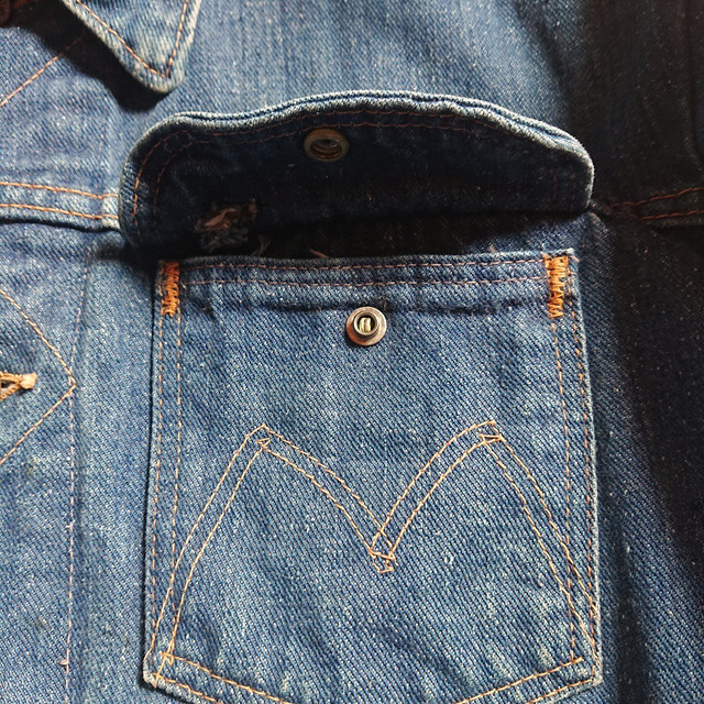위 매버릭 재킷을 보면서 유의 깊게 봐야할 부분이 있다면 단추의 간격. 마지막 부분이 허리를 잘라내 수선한 듯 간격이 짧다. 원래 그렇다. 또 하나는 양 가슴 주머니 위의 M 모양 자수다. 뭐 재봉틀 붙잡고 계신 분에게 알아서 M자 그려 넣으라고 한 거 같다. 나름 시그니처 로고일텐데 양쪽의 일관성이 전혀 없다. 역시 원래 그렇다. 가지고 있는 건 80년대 제품인데 모양이 정돈되어서 M자가 그냥 두 줄이다. 나중에 와서는 다시 리바이스의 갈매기 자수처럼 가지런하게 겹쳐있는 방식으로 바뀐다.