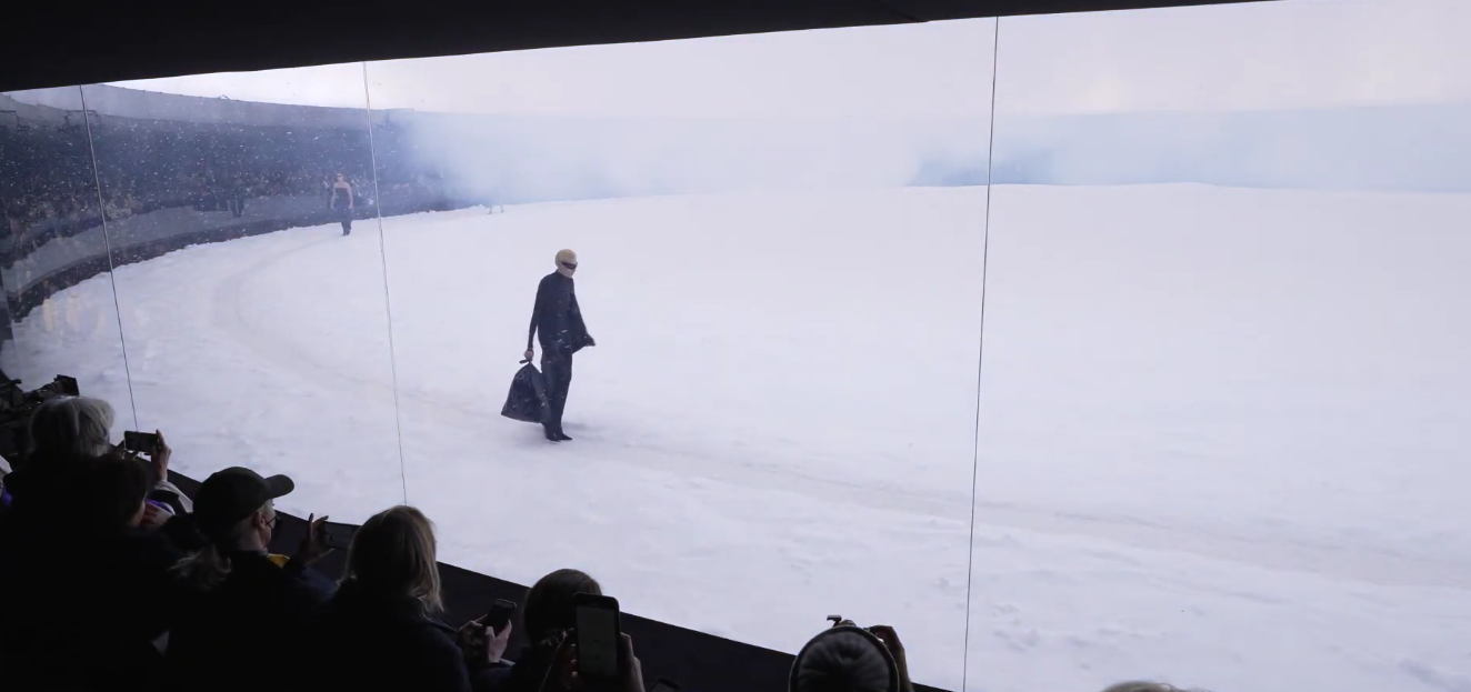 2022FW 발렌시아가는 한동안 시커먼 화면 속에서 대기를 타더니 눈보라가 치는 길을 모델들이 걸어 나오기 시작했다. 모델 역시 참 극한 직업이구나 라는 생각이 절로 든다. 그리고 유리 칸막이 안 보다 안락해 보이는 곳에서 사람들은 그 걸음을 본다.