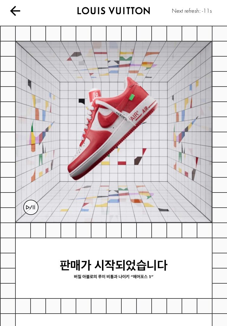 루이 비통 + 나이키 에어포스 드로우 비슷한 게 있다길래 구경을 해봤다. 웨이팅룸 페이지에 대기하고 있으면 1분에 한번씩 리프레시가 되고 선택된 이들은 입장이 되고 구매를 하는 시스템이다. 선착순이 아니라는 점에서 오프라인 매장 웨이팅하고는 조금 다른데, 들어가도 찾는 제품이 없다는 점에서는 오프라인 매장 웨이팅과 같다.