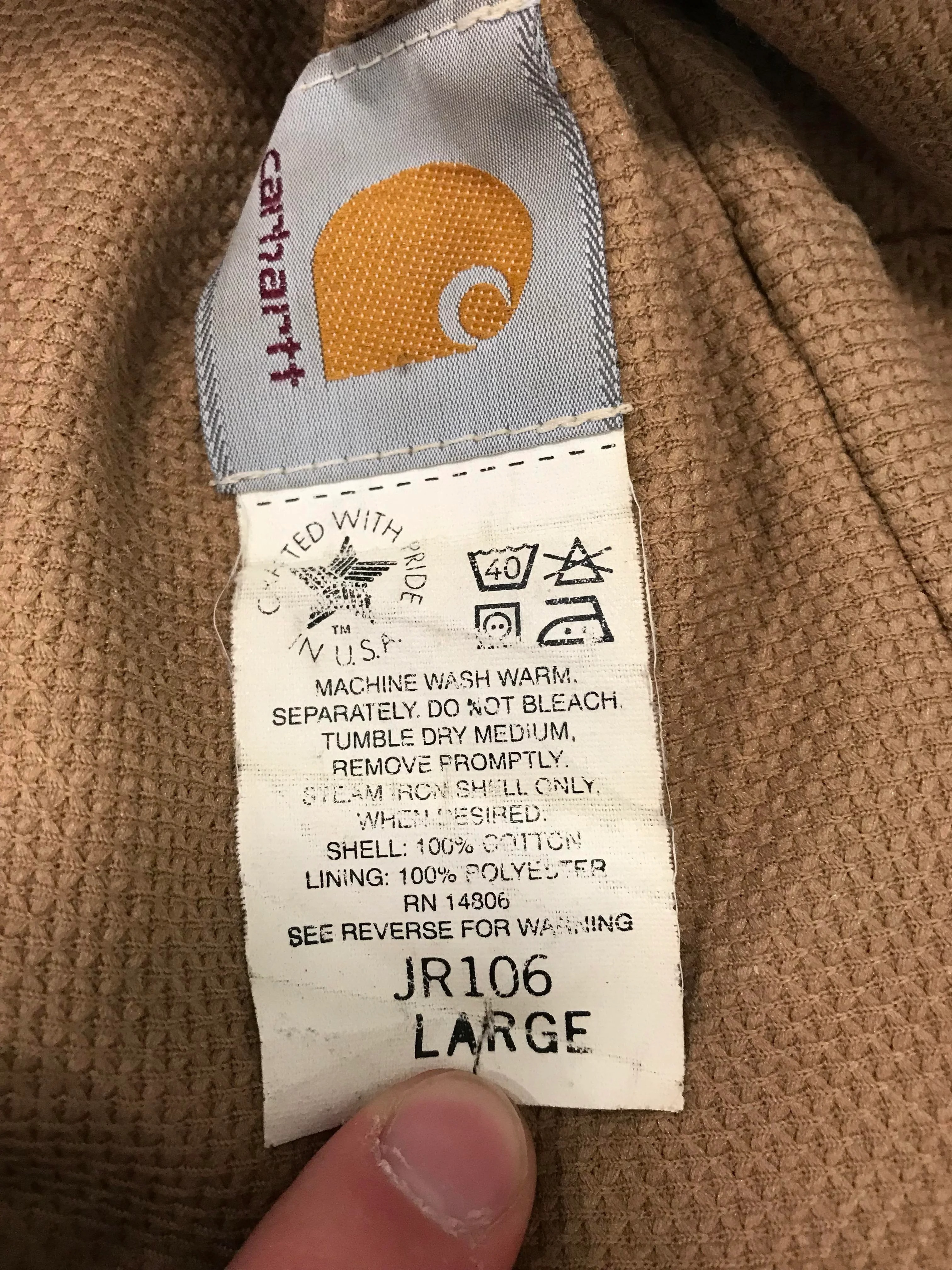 이게 약간 문제인데 칼하트 일본 라이센스판 안에 들어 있는 케어 라벨이다. 약간 재미있는 건 리바이스도 그러하듯 한참 보다보면 같은 제품이라 하더라도 일본판과 미국판이 뭔가 다르다는 걸 느끼게 된다. 뭐라 딱 말하긴 어렵지만 중고 사이트에 올라와 있는 사진 만 봐도 이건 일본판인가 느껴지는 게 종종 있는 데 사이즈 뿐만 아니라 어딘가 다름.