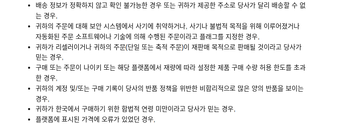 그리고 그 아래 보면 판매 거부 사유들이 있는데 봇이 구매한 경우, 리셀러인 경우, 비합리적 많은 양의 반품, 가격 표시 오류 등 모두 제한 사유다.