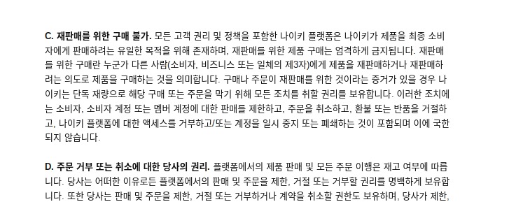 나이키가 멤버십 개편을 하고 있는데(개인정보를 미국에 보낸다는 팝업 그만 좀 떴으면 좋겠다) 아마도 나이키 snkrs 앱이 나오려고 그런가보다 싶다. snkrs앱이 출시된 나라에서는 사이트 이용 시간 뭐 이런 것들이 구매에 영향을 미친다는 거 같다. 아무튼 그러는 사이에 약관 변경 공지가 떴는데 거기에 리셀링에 대한 항목이 포함되었다.