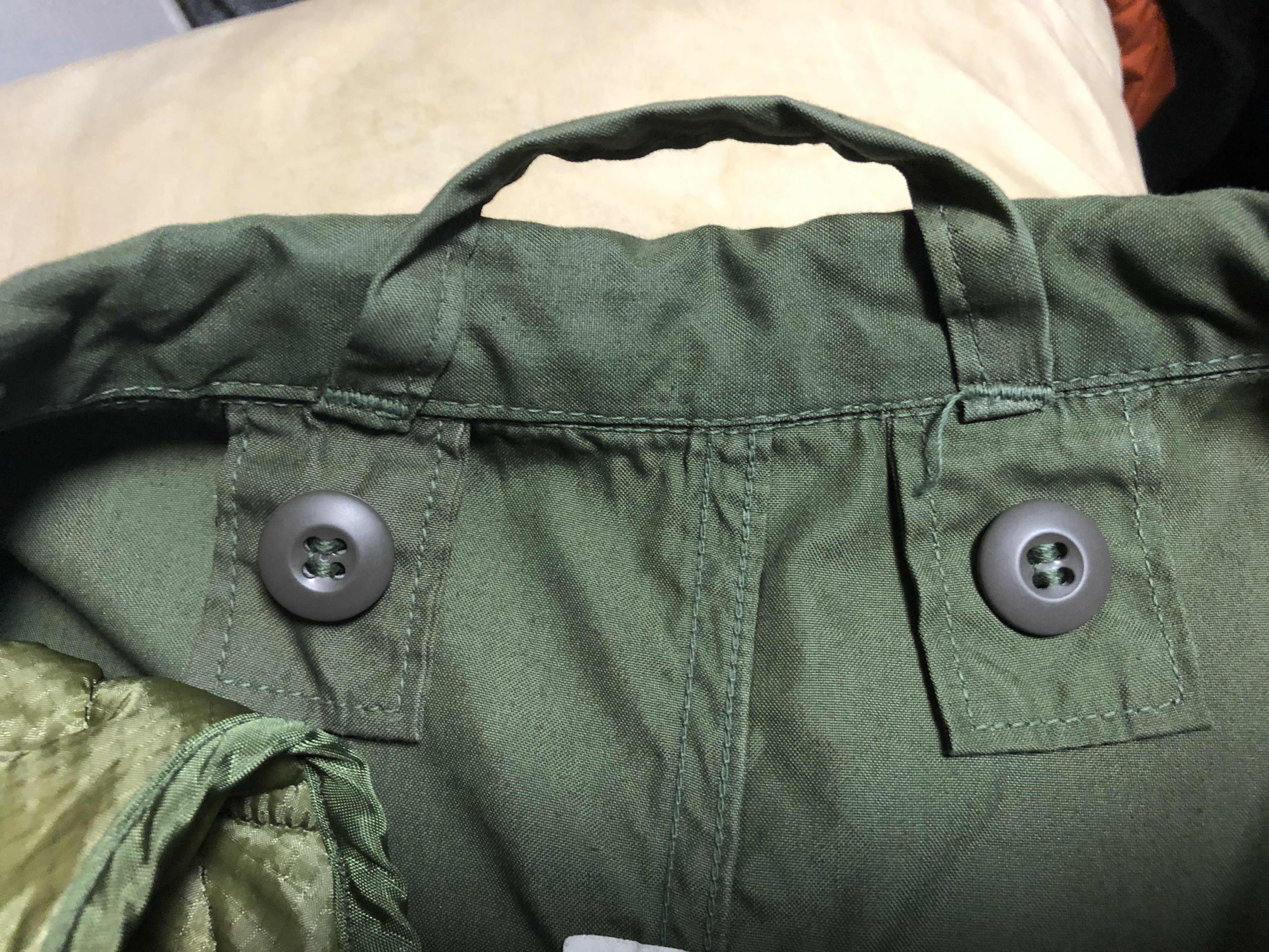 쉘 소재와 같은 이너 결합 고리와 옷고리. 70년대 언젠가부터 저 고리 부분이 나일론 소재로 바뀐다. 더 이전 건 단추가 다르게 생긴 것들이 있는데 단추는 위 사진의 소위 퍼티그 단추가 좋다. 사실 M-51에 붙어 있는 그 갈색 단추가 최고 좋은 데 피시테일보다는 헌팅 자켓 같은 데 더 어울릴 거 같긴 하다.