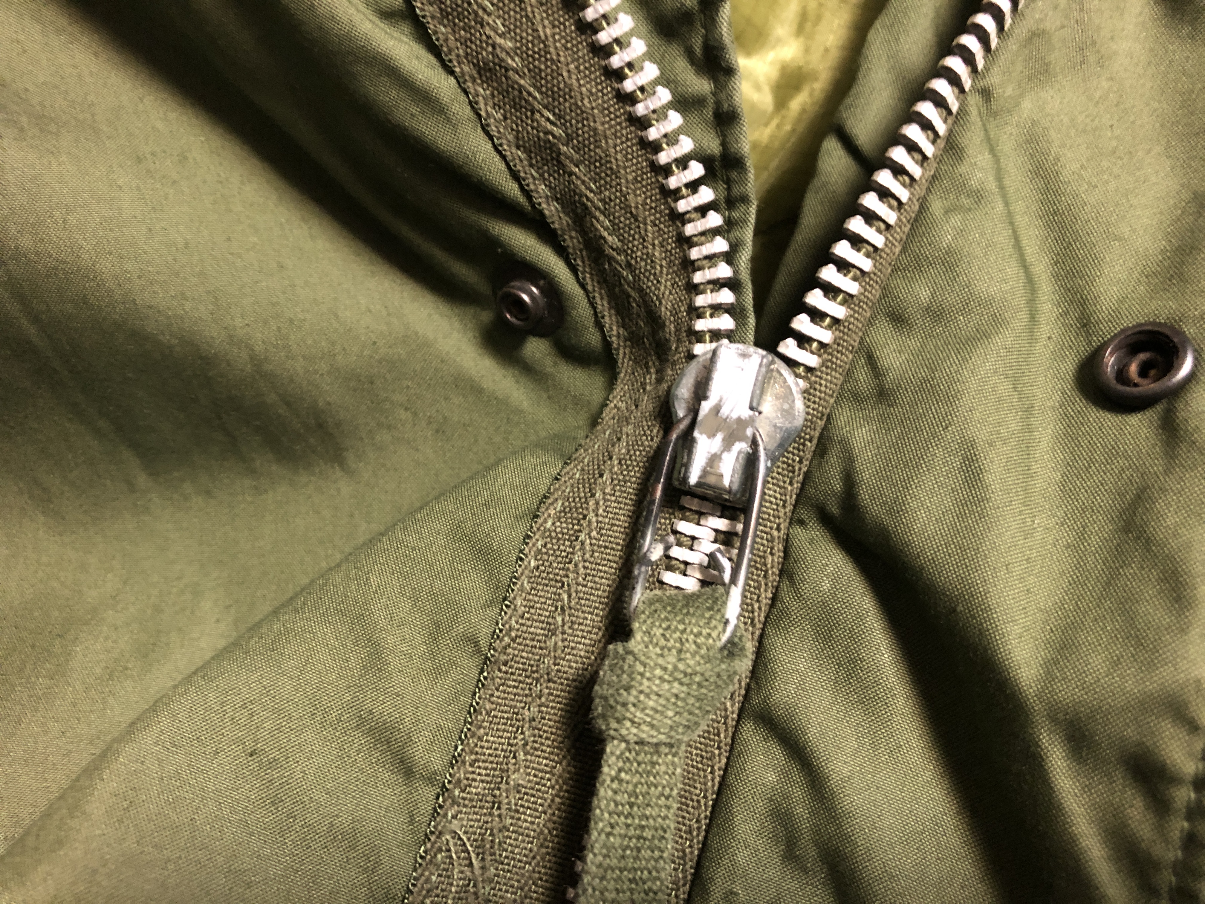 알루미늄 지퍼. 이것도 70년대 들어 브라스로 바뀜. 사실 황동색을 더 좋아하긴 하는데 M65 필드 자켓을 브라스로 가지고 있으니까 이건 알루미늄이 어떨까 이런 생각을. 하지만 오래되었다는 점 말고 왜 알루미늄을 더 선호하는 지는 잘 모르겠다. M65 필드 자켓과 파카, 사틴 BDU와 헤링본 트윌 바지를 가지고 있기 때문에 시대가 살짝 안 맞긴 하지만 다 챙겨 입으면 60~70년대 미군의 기분을 살짝 느껴볼 수 있기는 하다. 무겁겠지. 실행해 볼 생각은 없다.