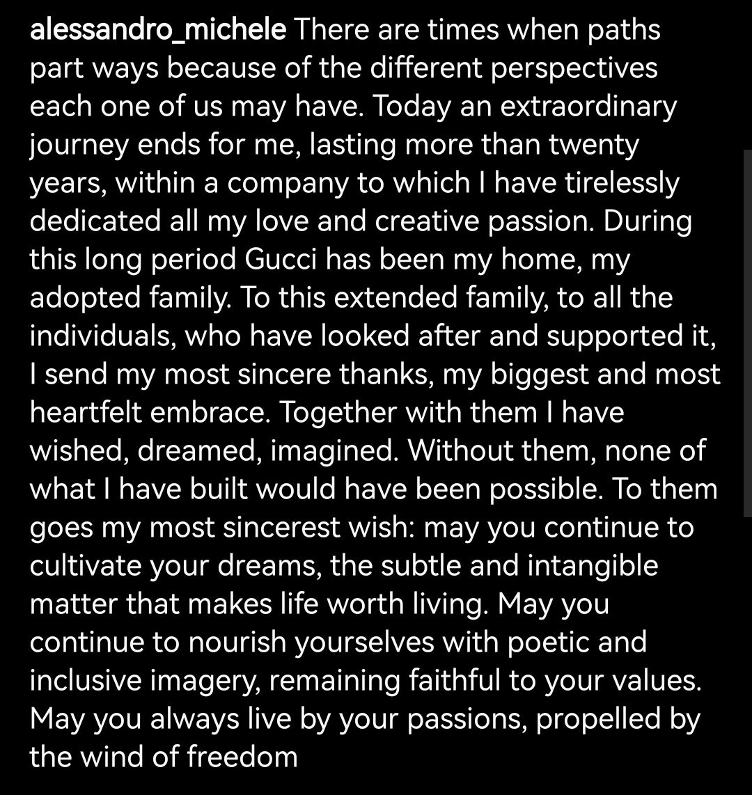2015년 구찌의 크리에이티브 디렉터가 되어 변화를 이끌던 알레산드로 미켈레가 구찌를 나갔다. 어제 WWD에 루머 뉴스가 뜨더니 바로 오늘 알레산드로 미켈레가 인스타그램에 나간다는 포스트를 올렸다. 이런 움직임에 대해 케링의 CEO인 프랑소와 앙리 피놀트의 경영 스타일이라는 이야기도 있고 알레산드로 미켈레에게 구찌를 맡긴 장본인인 마르코 비자리와의 예전 같지는 않은 관계 뭐 이런 이야기들도 있기는 한데 그런 거야 별로 중요한 지점은 아닌 거 같다.