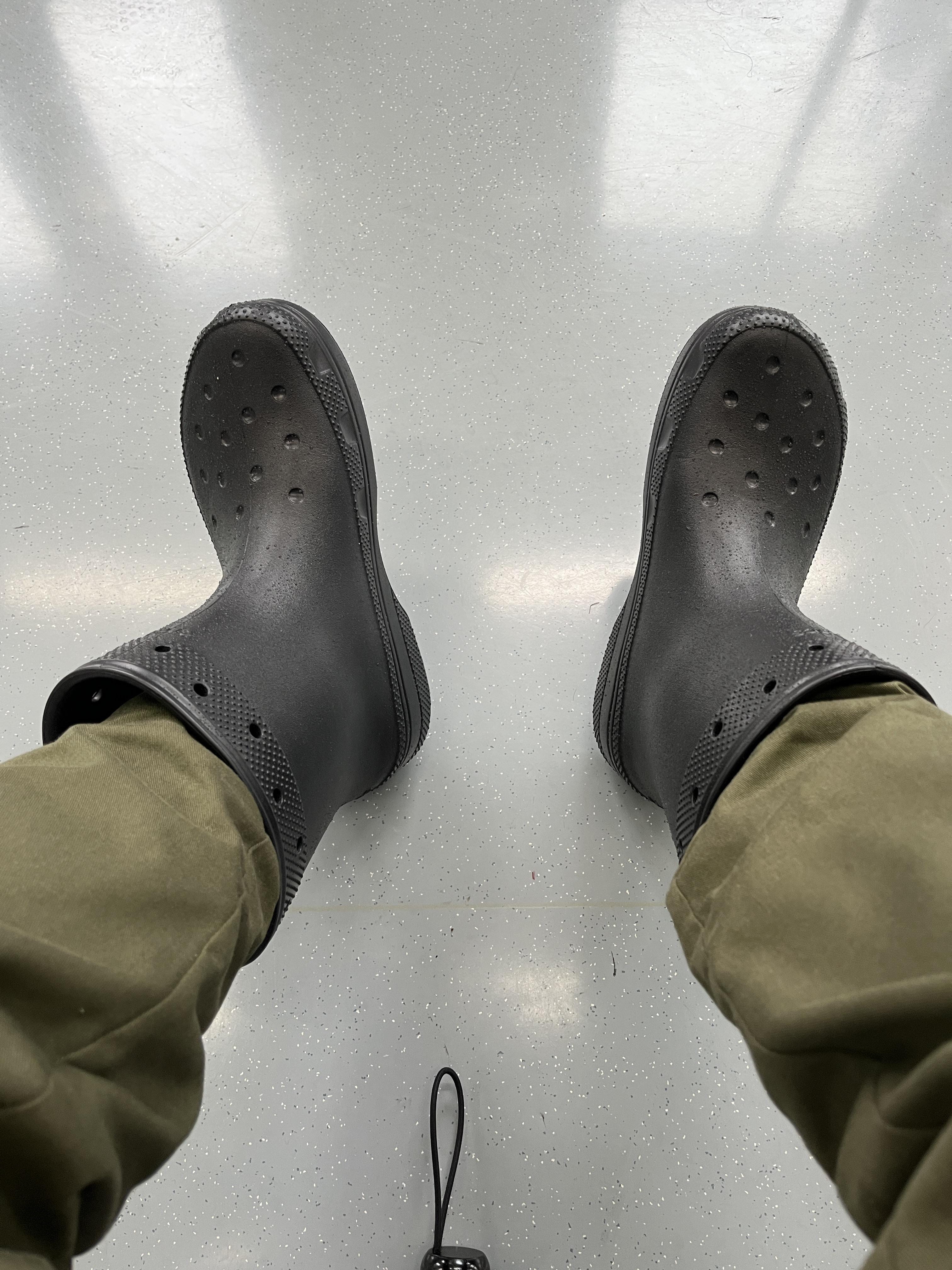 먼저 크록스의 레인부츠. 1년 내내 양말은 신고 주로 운동화를 신고, 발이 뭔가 불편하면 HP가 훅훅 떨어지는 타입의 인간이라 비가 신발을 타고 들어와 양말이 젖어서 만들어지는 무기력함의 해결이 주요 문제 중 하나였다. 레인부츠나 고어텍스 등 방수류 운동화를 살까 했지만 비용, 못생김, 불편할 거 같음 등으로 망설이다가 생활의 쾌적함과 즐거움이 무엇보다 먼저 해결해야 할 일이 아닌가 라는 생각 끝에 크록스의 클래식 레인부츠를 구입. 클록스라면 편안함의 대명사니까 좋지 않을까라는 생각이 컸음. 클록스에는 몇 가지 레인부츠가 있고 크러쉬 레인부츠가 보다 어글리한 생김새 덕분에 인기도 있는 듯 한데 클래식 레인부츠다. 그냥 작업화랑 비슷한 느낌.