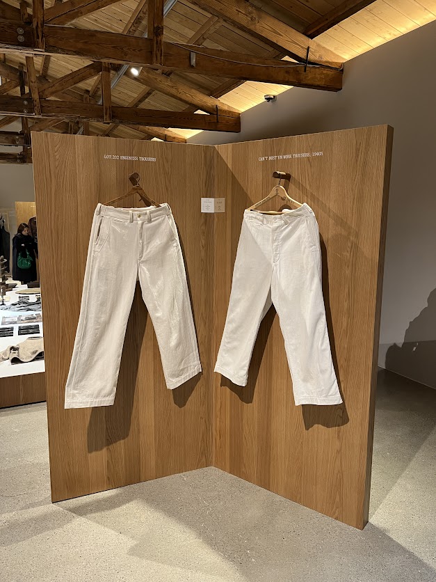 예컨대 원본 M-65 대신에 리얼 맥코이의 M-65를 구입할 이유는 무엇인가 같은 질문에 대한 답이 되기도 하고, 거의 모든 옷이 결국은 어느 정도 과거의 복원에 기반하고 있는 상황에서 변형 재현에서 변형의 가능 범위는 어디까지인가 하는 의문을 만들기도 한다. 아무튼 이렇게 봤을 때 복각 기반의 브랜드치고 얇은 직물을 꽤 많이 사용하고 있는 점에(과거의 미국 옷을 마주쳤을 때 가장 먼저 드는 느낌은 그 둔탁한 두꺼움이기에) 약간의 의문이 있었는데 교토의 날씨, 즉 이 옷이 만들어지고 입는 환경과 기후를 생각해 보면 그것도 일리가 있겠다 싶기도 하다.