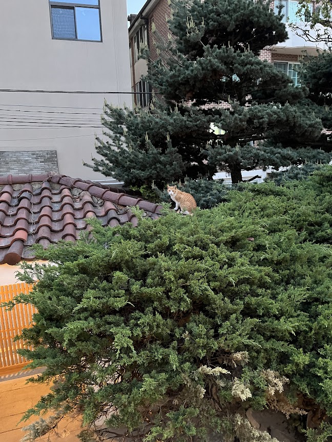 사람들의 시선이 집중되자 당황한 지붕 위의 고양이. 르메르가 꾸며놓은 정원이 예쁜 집에서 사는구나, 좋은 곳을 골랐군.