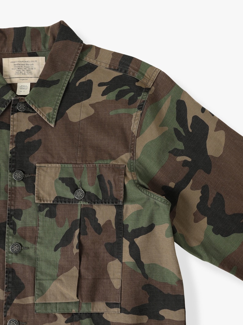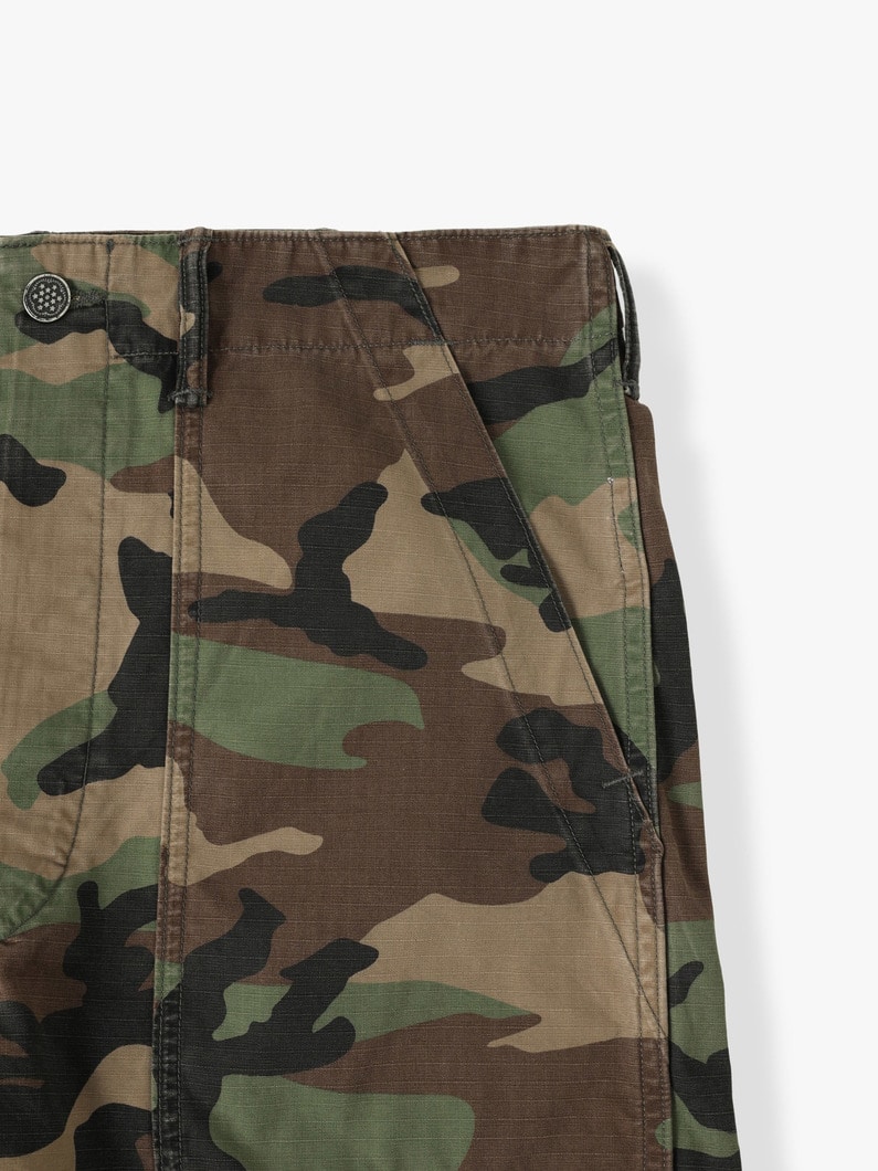 BDU 류의 평범한 군복 셔츠구나 싶지만 자세히 보면 약간 재미난 것들이 있다. 13 스타 메탈 버튼, 약간 길쭉한 벨로우 포켓이 눈에 띄고 쇼츠 팬츠는 퍼티크 팬츠의 디테일이다.