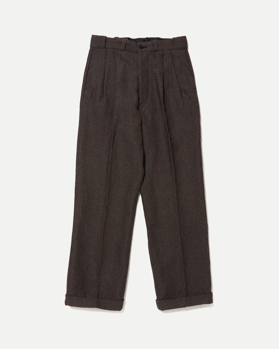 올해 여기저기서 오트밀 직물이 많이 보인다. 입체감이 있지만 패턴이 규칙적이기 때문에 단조롭게 보이고 금세 질리는 면이 있다. 그러므로 여기에는 입체감을 불규칙하게 돋보일 장치가 필요하다. T.T가 워크 팬츠에 사용한 건 울 55%에 리넨 45%가 얽혀있는 직물이다. 울의 경우 1세기 쯤 된 데드스톡 셰틀랜드 건조 울을 모방했다고 한다. 이런 옷은 막상 보면 망설여질 지도 모른다.