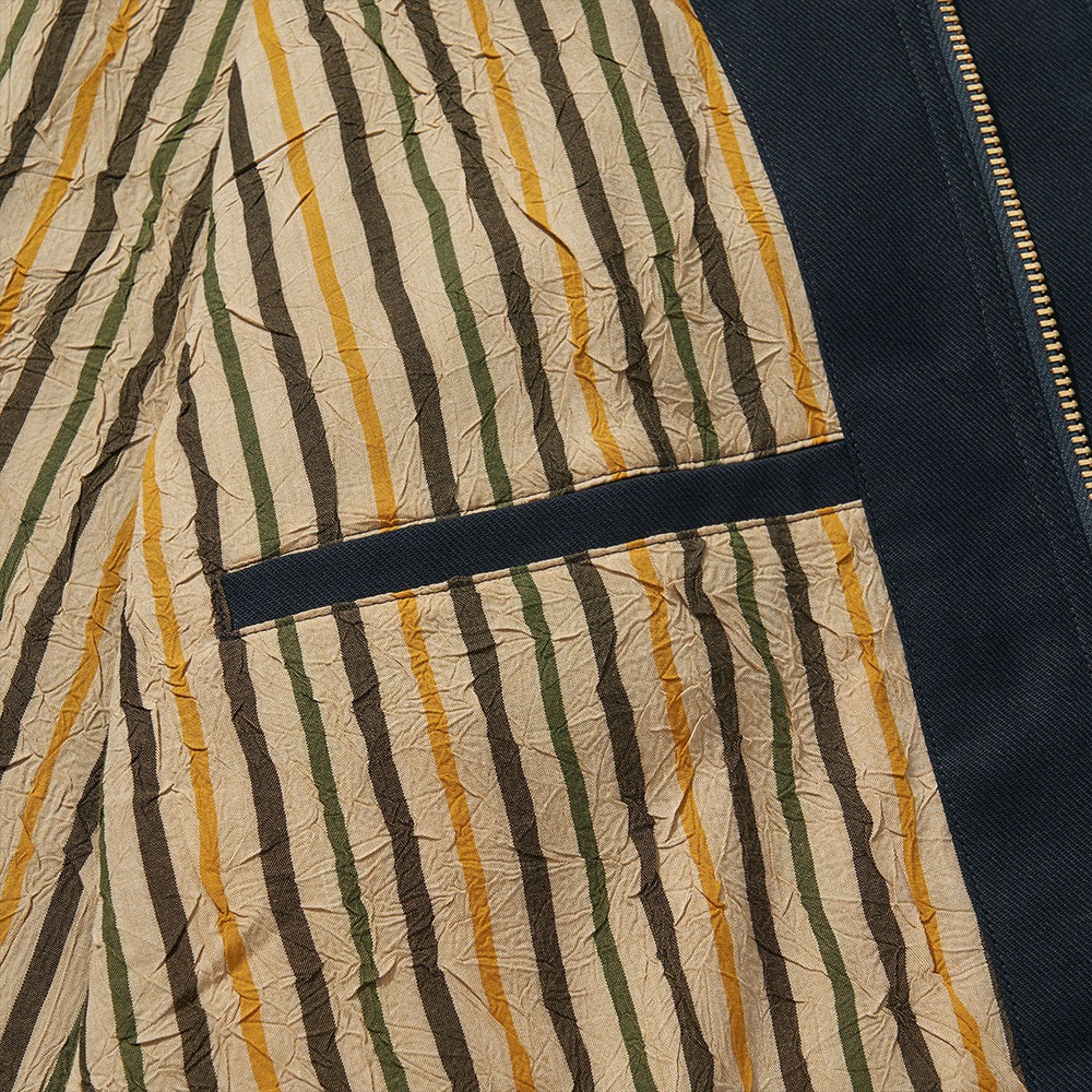 안감은 부드럽고 가벼운 합성 소재 등도 검토를 했었는데 역시 이 캡슐 컬렉션은 코튼의 다양성을 중심으로 하고 있기 때문에(가방과 반바지에서 뒤집어 봤지만) 코튼을 뒤적거렸다. 결론적으로 선택한 살짝 까칠하고 주름이 많은 안감은 예전에 VDR의 제품에 썼던 옷감인데(색은 달랐다) VDR 사무실에 옷감 쌓여있는 것들을 들추다가 써보기로 했다. 약간 서늘한 느낌도 나고 컬러 조합도 꽤 좋은 매칭이라고 생각된다. 사실 모든 걸 다 의도대로 하기는 쉽지 않고, 비용 문제도 있는데 종종 이런 우연이 만들어 낸 즐거움이 생기는 게 재미있다.