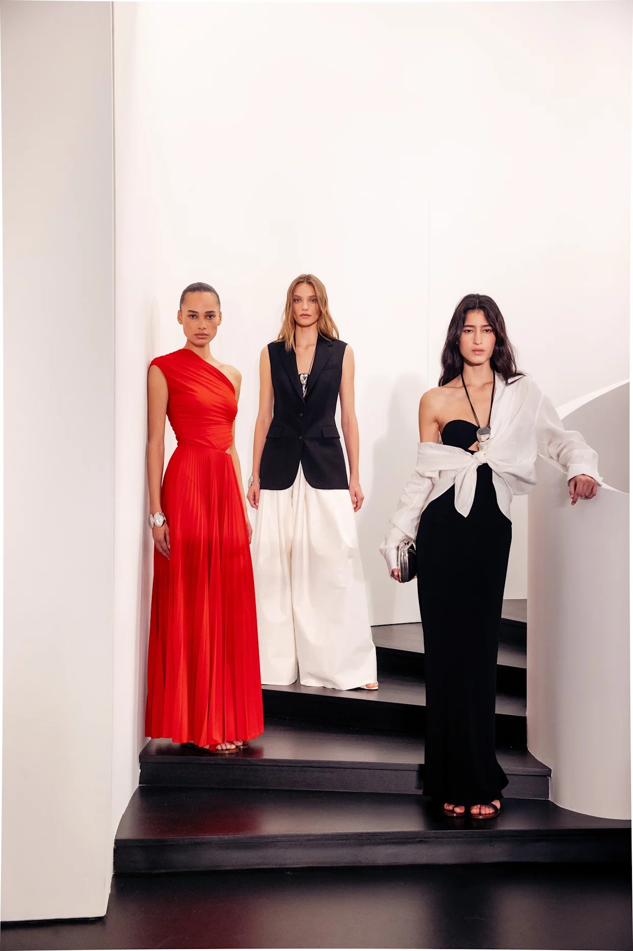 이번 랄프 로렌 컬렉션 2026 SS에서 눈에 띄는 점은 온통 블랙과 화이트 컬러로 이뤄져 있다는 거다. 네이비, 실버 이런 것들이 조금씩 섞여 있긴 한데 끝나고 나면 흑백만 생각이 남. 그것도 차가운 느낌의 톤으로 미니멀함과 고저스함을 함께 싣는다. 여기에 레드가 포인트로 들어가는 데 총 50룩 중 완전 레드가 5룩이다. 평균적으로 블랙 앤 화이트가 9벌 지나가고 나면 레드가 하나 갑툭튀한다는 의미. 뭐랄까... 지나치게 도식적이라 할까 싶지만 그렇게 규칙적으로 나오진 않고 앞 부분에 레드가 우르르 나왔다가 중간에 슬쩍 나왔다가 마지막에 하나 나오고 이런 분위기로 흐른다. 그것마저 정형화스럽게 보이기도 한다.