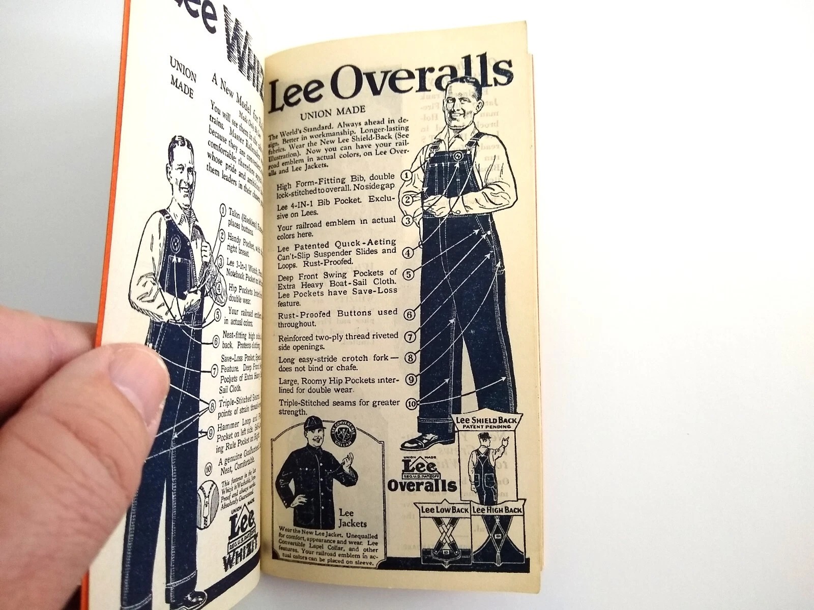 오른쪽 페이지 아래에 Lee Jackets라고 적힌 게 레일로드 자켓이 아닐까 싶다. 철도 종사자들이 고객이라 맨 마지막 문구도 "Your railroad emblem in actual colors can be placed on sleeve."라고 적혀 있다. 복각판이나 빈티지 매장 쪽에서도 1940s와 1950s 정도 분리해서 판매한다. 참고로 참고로 91-J는 데님이고 92-J는 브라운 코튼 덕, 96-J는 핀 스트라이프 버전 등등이 있다.