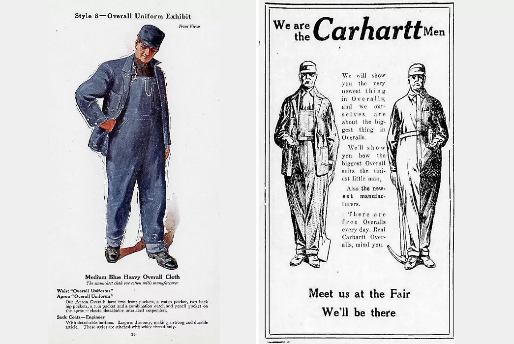 1920년대 칼하트의 광고. 엔지니어 색 코트라는 이름이 붙어 있다. 라지 앤 루미, 스트롱 앤 듀러블. 처음에는 블루 데님으로 나왔다가 나중에 덕 코튼이 메인이 된다.