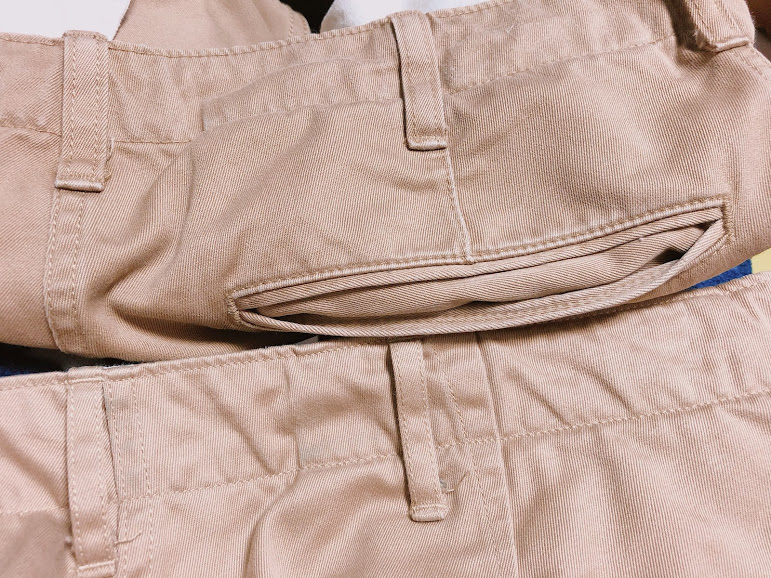 아무튼 다시 위로 돌아가면 유니클로는 브라운 컬러. 유니클로 치노는 색이 여러가지가 나온다. 버즈 릭슨은 베이지 컬러. 베이지와 카키였나 올리브였나 두 가지 정도 나오는 걸로 알고 있다. 둘 다 브라운 톤이지만 버즈 릭슨 쪽이 살짝 반짝거리고 자연광 아래에 있으면 복숭아 빛? 핑크 톤? 뭐 이런 느낌이 살짝 난다. 두께 차이가 약간 있는데 만져봐서는 티가 그렇게 나진 않고 입고 다니다 보면 버즈 릭슨 쪽이 더 두껍구나 알 수 있다. 사이즈는 버즈 릭슨이 한 사이즈 크다. 세탁하면 살짝 줄어든다고 해서 그렇게 했는데 지금 보면 둘이 허리 실측 사이즈는 거의 비슷하다.