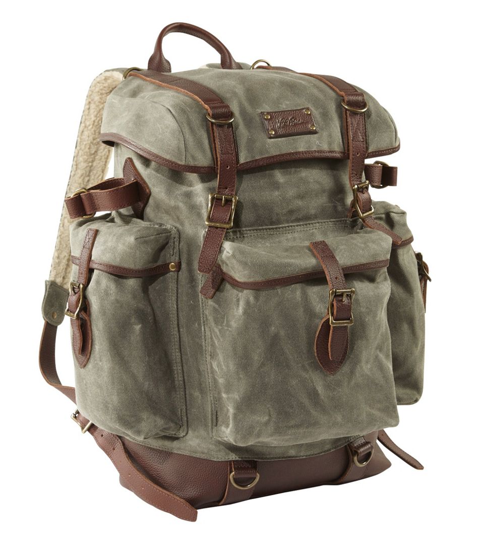 엘엘빈의 룩색. 왁시드 코튼, 가죽 덧댐, 탑 오프닝, 양갈래 버클, 이것저것 달 수 있는 부분 등등 이런 게 바로 룩색이 아닐까 싶다. 어깨끈의 플리스 라이닝이 상당히 인상적인데 마찰이 많은 부분에 저런 걸 대는 건 좋은 생각으로 보이진 않는다. 기본적으로 나일론과 퀼트, 패드가 없는 시절을 상정해 만든 거 같은데 그렇게 봐도 플리스는 앞뒤가 맞지 않는다. 혹시 진짜 양털이라면 꽤 굉장한 시대 복원인데 뭐 저렇게까지...라는 생각이 들기도 하고, 가죽을 저렇게 사용했는데 양털 정도는 써도 되겠네 싶기도 하고.