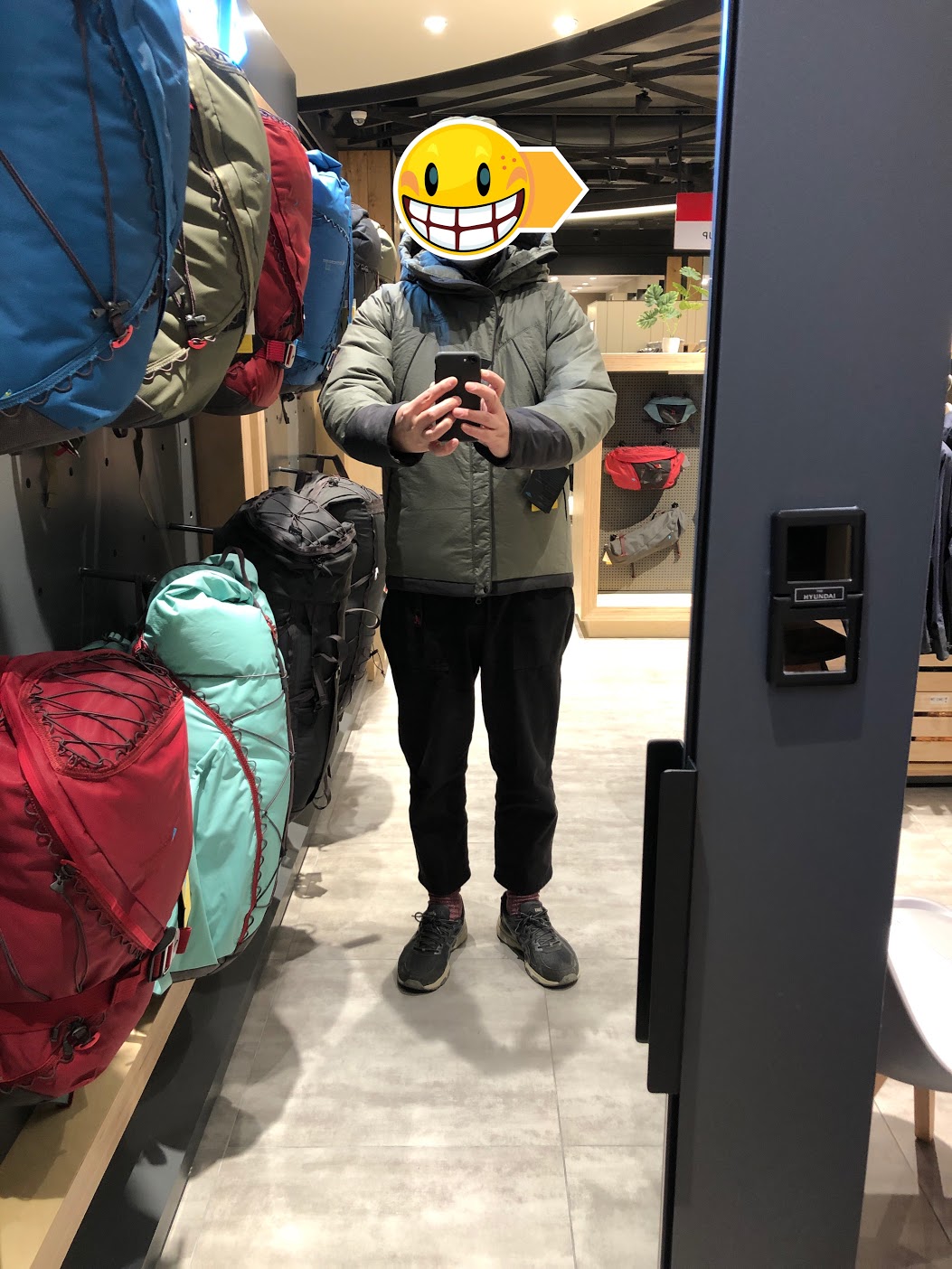 이런 사진은 왠지 얼굴 모자이크를 하게 되는... 유럽 옷 답게 허리는 좁고, 팔은 길고, 어깨와 몸 라인이 좀 이상하다는 생각이 드는 옷이고 S 사이즈를 입어봤지만 만약에 구입한다면 M을 골라야 겠구나 하는 등등의 생각을 했다. 겉감과 안감이 모두 면이고(친환경 발수 코팅이 되어 있다, 그게 뭔지는 모르겠다, Katla Cotton이라는 이름이다 - 설명링크, 아무튼 얇고 부드럽다), 충전재는 White Goose Down 93/7 (93% Goose Down, 7% Feathers), Fill Power 800+, 88% Wool, 12% PLA (bio-polyester) Mulesing and Chlorine-free Certified by Responsible Down Standard 이렇게 적혀있다.