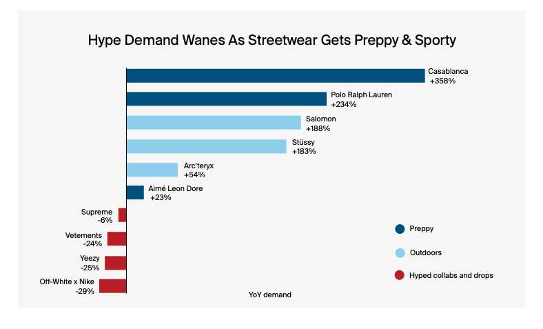 아무튼 기사에 따르면 슈프림, 베트멍, 이지, 오프-화이트 같은 브랜드의 거래량이 최대 30% 감소했고 대신 프레피, 스포츠웨어 스타일이 부상하고 있다고 한다. 여기서 스포츠웨어와 슈프림 등은 겹치는 게 아닌가 싶어서 리포트를 찾아봤는데 조금 더 정확히 말하자면 아웃도어, 스트리트웨어도 이제 헤리티지에 기대는 면이 나타나고 있다는 의미다.