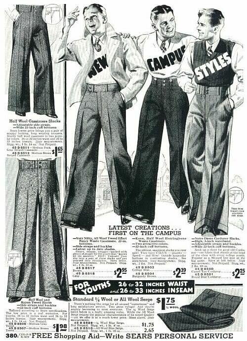 당시 룩을 보면 바지를 어지간히 크게 입기들 했다. 옛날 영화를 보다 커다란 바지가 나오면 이런 이유다. 니커보커, 플러스 포, 옥스퍼드 백 모두 종종 볼 수 있다.
