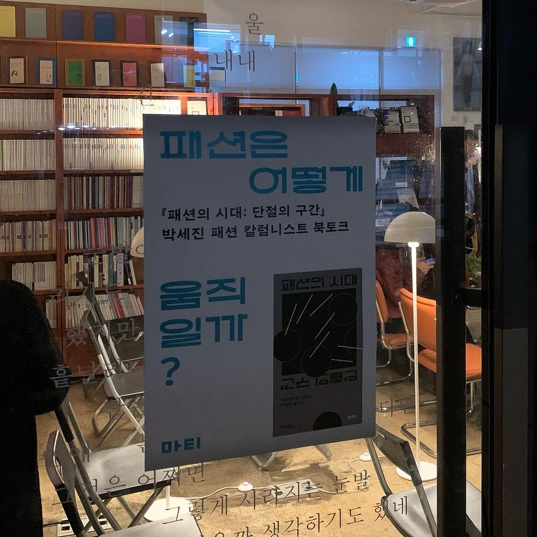 10월 26일 망원동 진부책방 스튜디오에서 패션의 시대 : 단절의 구간 북토크를 했습니다. 번개도 치고 비도 내리고 덥고 집에 갈 때는 바람 불고 춥고 날이 상당히 이상했는데도 찾아와 주신 분들 감사드립니다. 오래간 만에 하는 북토크라 준비를 한다고 했는데 얻어가시는 게 있었는지 모르겠습니다.