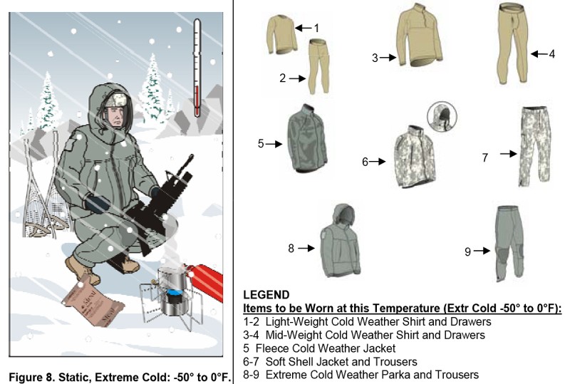 그러므로 히트텍 - 스웨트 - 다운 파카 정도로 입는 게 가장 효율적이다. 여기에 머플러, 장갑, 울 양말 등을 사용하면 된다. 겨울 강풍에는 귀에서 목 뒤로 이어지는 부분이 매우 취약하기 때문에 후드를 뒤집어 쓰는 게 가장 낫고 군밤 장수 모자(트래퍼 햇) 같은 걸 쓸 수 있다면 좋다.