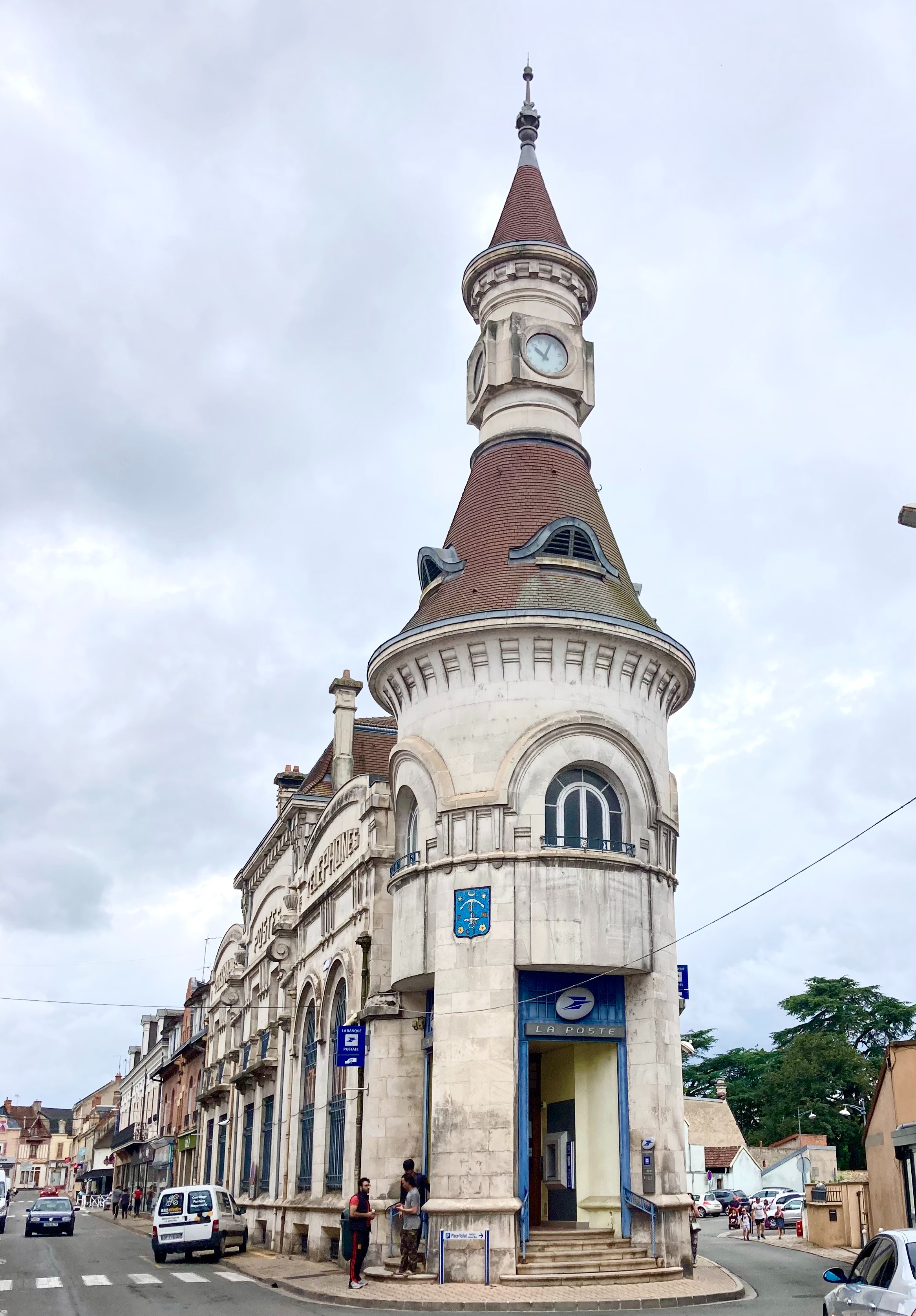 아래 오른쪽은 우체국이다. Claudius Malord(Paray-le-Monial)가 설계한 건축물로 20세기 전반에 지어졌다. 전통적인 건축물과 바우하우스의 도래 사이의 전환기 건물이라는 의미가 있다고 한다. 우체국 벽면에 보면 파란색 문양이 있는데 디구왕의 문장이라고 한다. 다시 자수 라벨을 보면 왼쪽 위에 가운데 그려진 방패 같은 게 저거 아닌가 싶다.